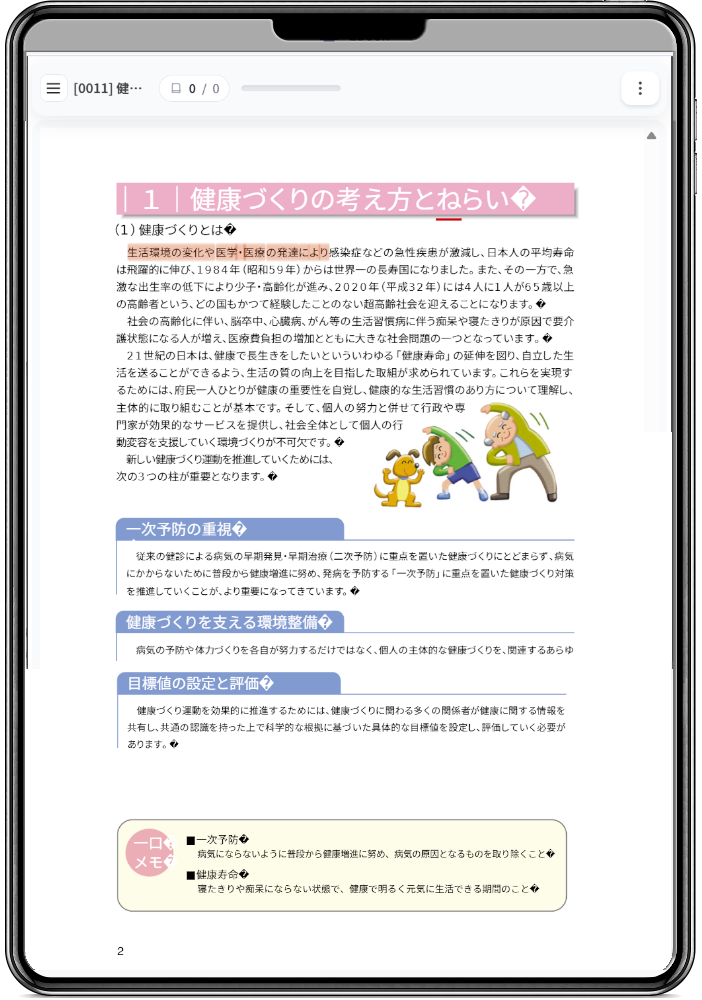 お手持ちの教材PDFをLMSに登録するだけで、簡単にデジタルテキスト(Ebook)を生成できます。スマホやタブレットにも対応しているため、重い参考書を持ち歩かず、いつでもどこでも気軽に学習可能です。