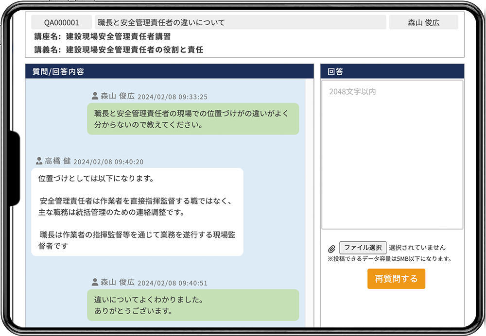 回答内容は受講者サイト上で共有されるため、誰でも確認可能です。