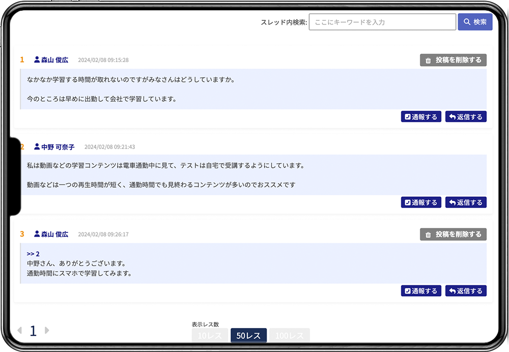 学習者同士の交流や講師への質問機能により、学習中の「わからない」や「不安」を解消できます。